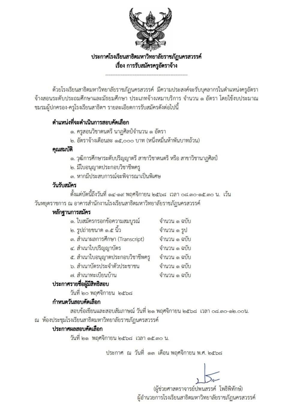 ประกาศโรงเรียนสาธิตมหาวิทยาลัยราชภัฏนครสวรรค์ รับสมัครครูอัตราจ้าง เอกวิชานาฏศิลป์ดนตรี จำนวน 1 อัตรา รับสมัครตั้งแต่วันที่ 14-19 พฤศจิกายน 2568 ในเวลาราชการ ณ อาคารสำนักงานโรงเรียนสาธิตมหาวิทยาลัยราชภัฏนครสวรรค์